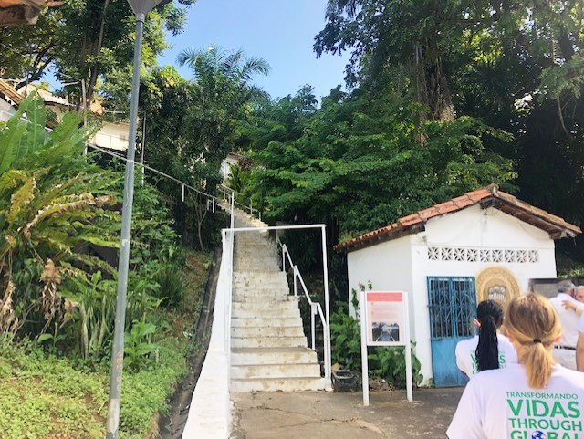 After lunch, we visited Casa Branco a Candomblé temple here in Salvador. Candomblé is an Afro-Brazilian religion that is very popular in this part of Brazil. When we arrived, we were greeted by a gentleman named Antonio Luis. Antonio was the only male priest currently serving at this temple, temples can be led by either a high priest or high priestess. He taught us a lot about the religion and the temple. The temple was located in the forest that was once far from downtown Salvador making it accessible only to those involved, thus allowing its members to worship freely. However, with city growth the temple is now surrounded by urban community. A priestess had left with the keys to the temple and so we went to visit the Casa de Jorge Amado (described below) then returned and climbed the stairs to the temple!